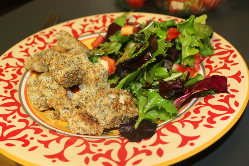 4.Transfer chicken tender pieces from egg white mixture and dip in the flour/seed/seasoning mixture to coat the chicken nuggets.
