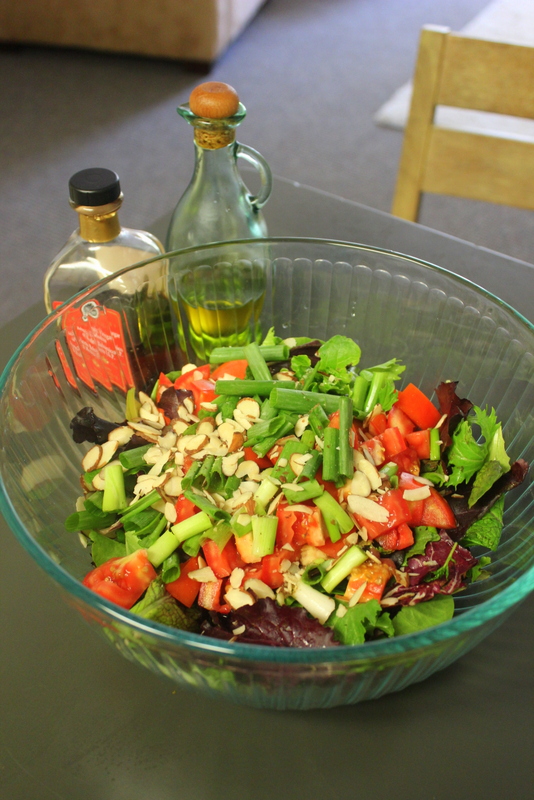The delicious salad made of mixed leaves, tomatoes, scallions and flaked almonds.  The dressing is the traditional olive oil with balsamic vinegar. Voila!